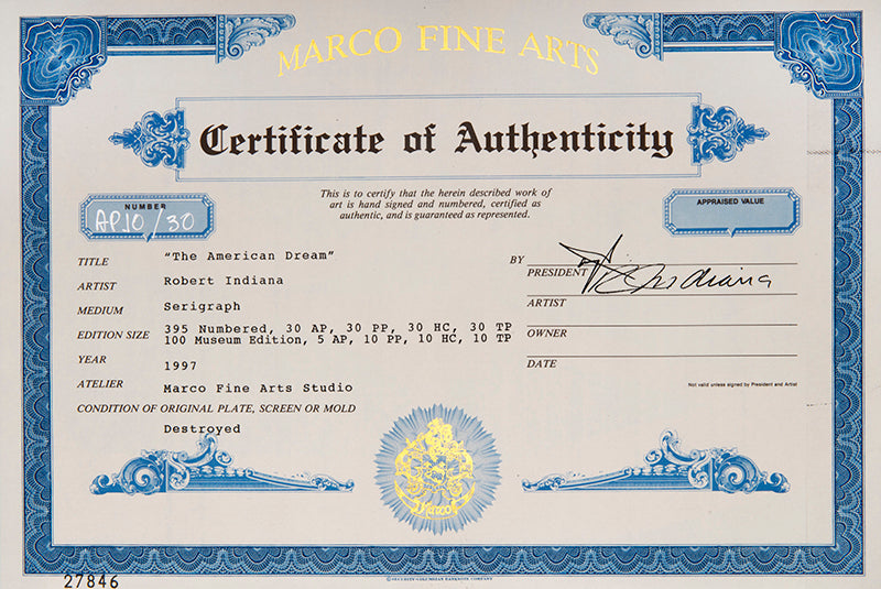 The complete portfolio of 30 screenprints in colours (24 bound in and six removable as issued), each signed and numbered in pencil, number 10 of 30 artist's proofs aside from the numbered edition of 395, printed on hand-pulled Coventry 300 gram acid free paper, presented in the publisher's original white cardboard printed box and accompanied by a certificate of authenticity issued by the studio and signed by Robert Indiana, folio 57 x 44.5 cm. (22½ x 17½ in.)