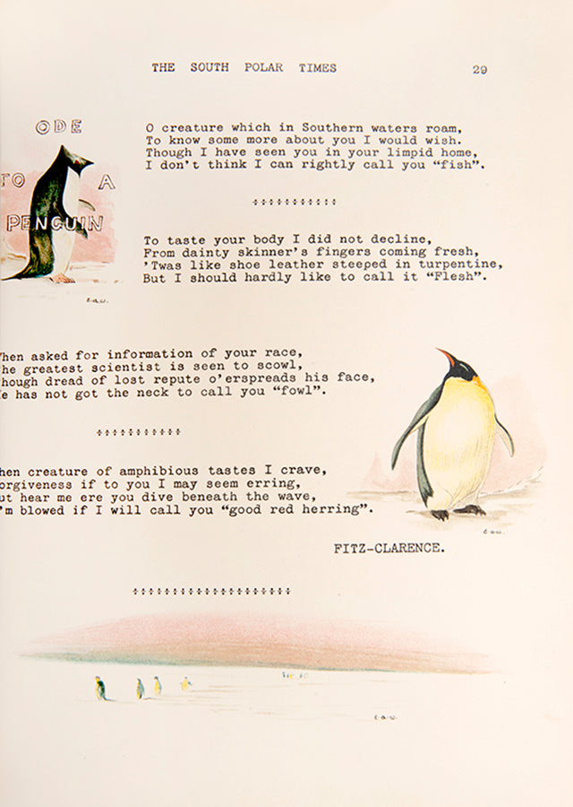 It was a tradition established on Arctic expeditions and enthusiastically taken up by Scott on his first trip south in 1902, when he appointed his team-mate Ernest Shackleton editor of the South Polar Times... After a well-lubricated banquet featuring noisettes d'agneau Darwinian and charlotte russe glacée à la Beardmore, Cherry presented the South Polar Times to Scott with everyone gathered around the table and a Christmas tree made from ski poles. The captain read most of it out loud, interrupted by uproarious laughter and indignant barracking' (Sara Wheeler, The Telegraph, 2012).