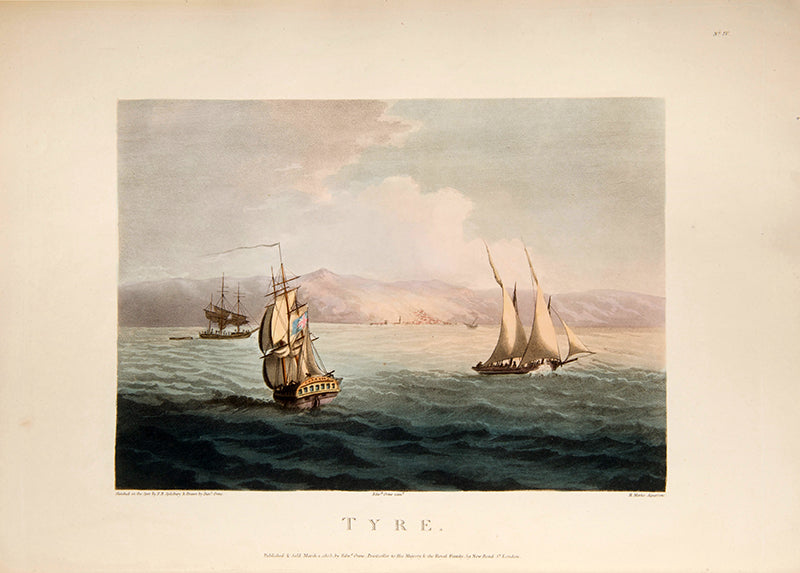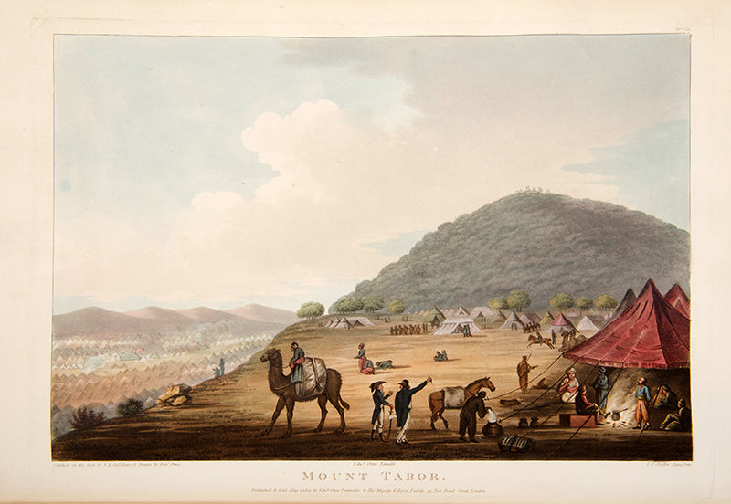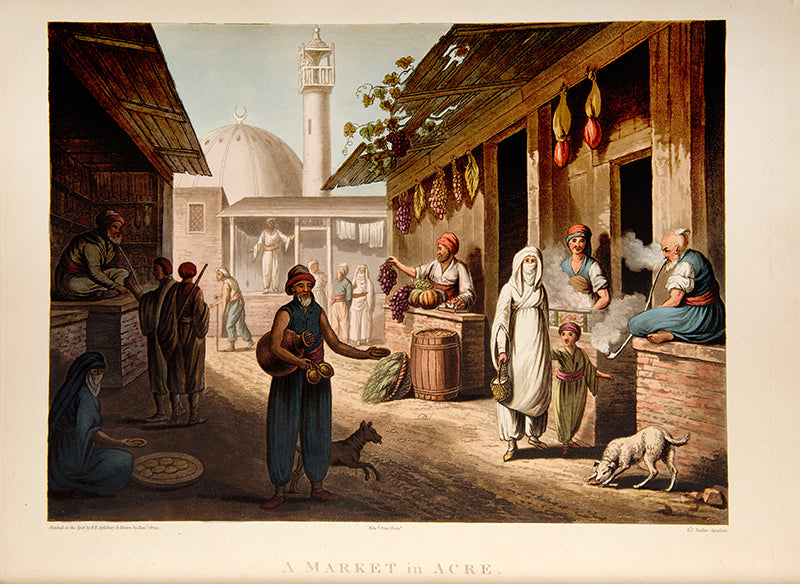 A charming work including views of Acre, Sidon, Tyre, Beirut, Jaffa, Mount Tabor, Tripoli, Caeserea, and fine genre scenes showing costumes and environs. The quality of the plates in this edition is far superior to later issues.