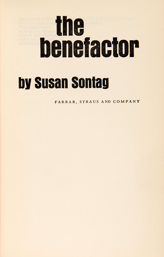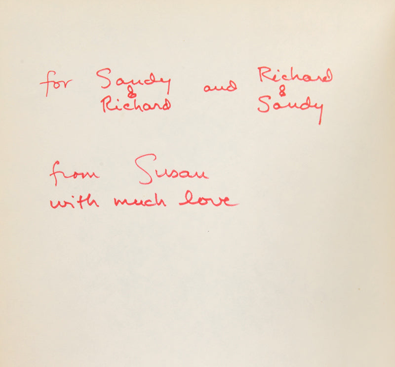 An important association copy of Sontag's uncommon first book, inscribed by the author at the beginning of her fiction-writing career on verso of front free endpaper: 'For Sandy & Richard and Richard & Sandy / from Susan / with much love'.The recipients were the American poet, literary critic, essayist, teacher, and translator Richard Howard, and his partner, the American novelist Sanford 'Sandy' Friedman. Sontag has called Howard 'a very central figure in our culture, maintaining and giving eloquent voice and illustration to standards that are in peril today. Richard and I go back a long way. He's my first serious literary friend. He's not the first writer I ever met, but he was my first profound chum, ally, buddy, accomplice, brother in literature. We met soon after I came to New York in the beginning of the sixties, and we immediately started cooking up projects - things we wanted to sponsor and impose.'