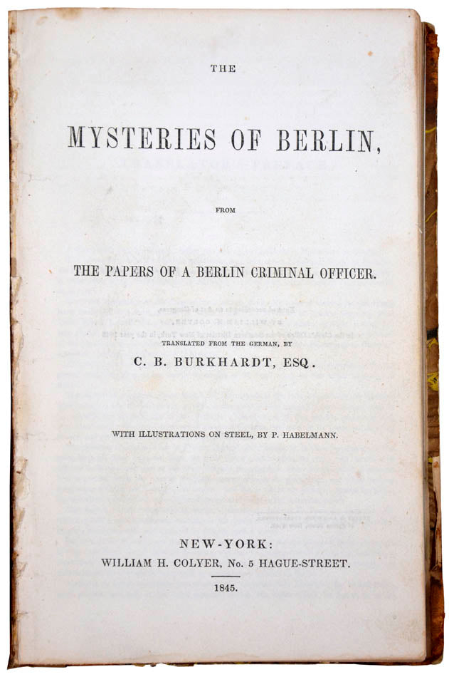 'The German language responded more vigorously to the new genre: Paul Thiel's Die Geheimnisse von Berlin ("The Secrets of Berlin," 1844) was immediately translated in New York as The Mysteries of Berlin (1845) with the business like subtitle From the Papers of a Berlin Criminal Officer. This was issued in ten parts at twelve and a half cents, and at a full 300,000 words was better value than Judson—it is also a strongly developed multi-stranded story with its own confidence. Several survivors head off to New York at the end and the cover blurb asserts the book has been "universally pronounced far superior to M. Sue's Mysteries of Paris."' Stephen Knight, The Mysteries of the Cities: Urban Crime Fiction in the Nineteenth Century, 2012.