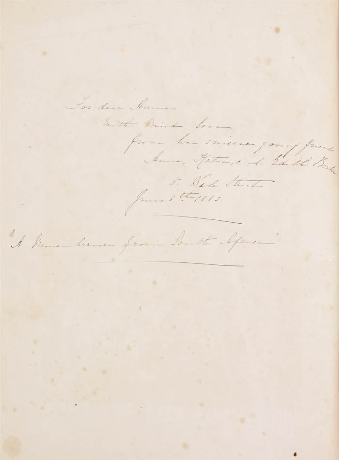 Provenance: Inscribed 'To dear Annie / with kind love/ from her sincere ??? friends / Anna, Katie, and Edith Bowler / 5 ??? Street / June 6th 1882 / A remembrance from South Africa'.