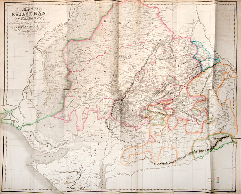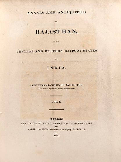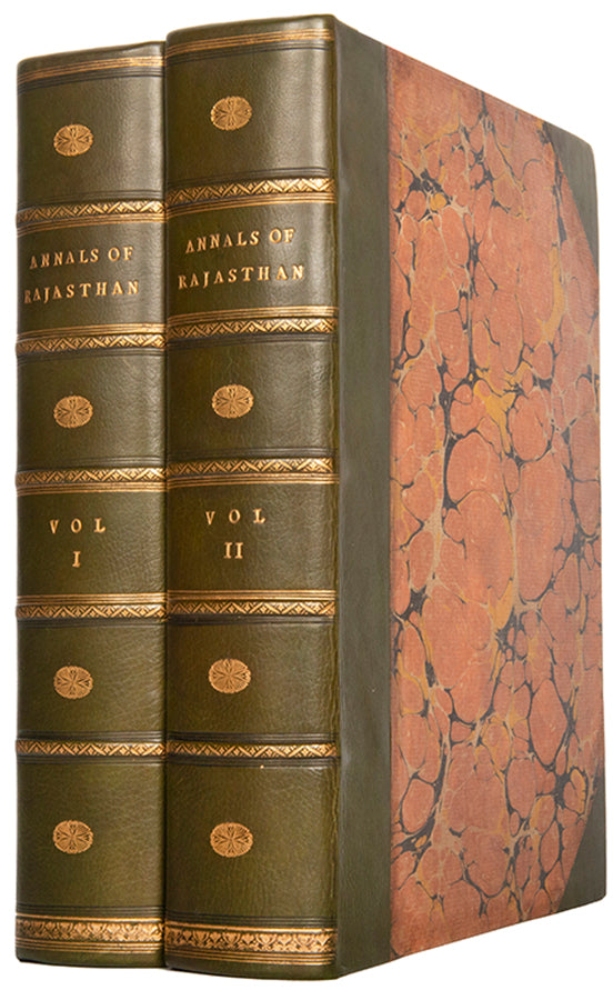 First edition. 2 vols, 4to, Large folding engraved map of Rajast'han hand-coloured in outline, 46 engraved plates (of which 4 folding), 3 lithographic plates (one folding, two on india), and 3 letterpress tables (2 of which folding). (lacks half titles and list of plates vol. 1, but with the errata leaf at end of vol. I), handsome modern olive green half morocco over marbled boards, gilt lettered direct, all edges gilt, a very good set.