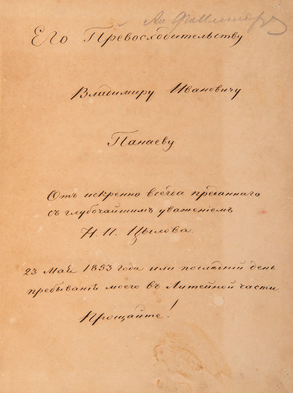 Tsylov's publications were printed in very small editions, possibly by subscription and had already become bibliographical rarities by the turn of the 20th century. The inscription from Tsylov to Panaev suggests that the two worked together and is wonderfully familiar for 19th century Russian civil servants. It reads, 'Your Excellency | Vladimir Ivanovich Panaev | sincerely and with the deepest respect your always devoted | N. I. Tsylov | 23rd May 1853 or the last day of my residency in the Liteyniy District | Farewell!'. Vladimir Ivanovich Panaev (1792-1859) was a privy councillor and secretary of state, reporting directly to Nicholas I.