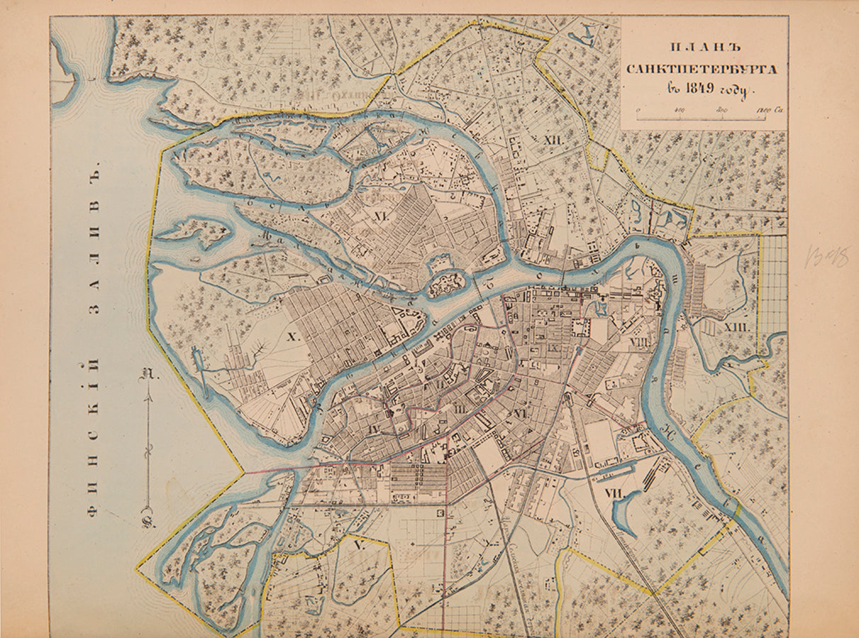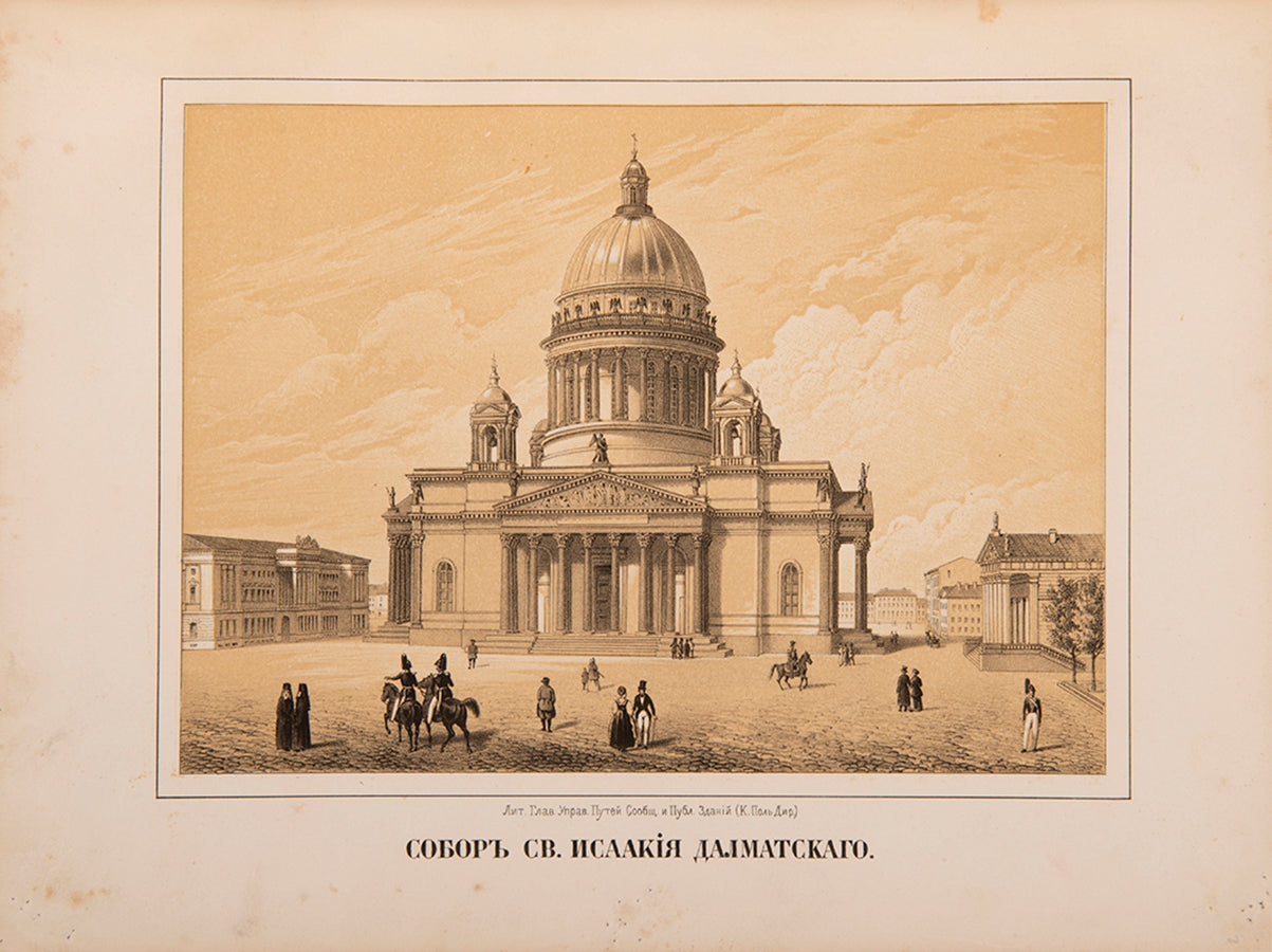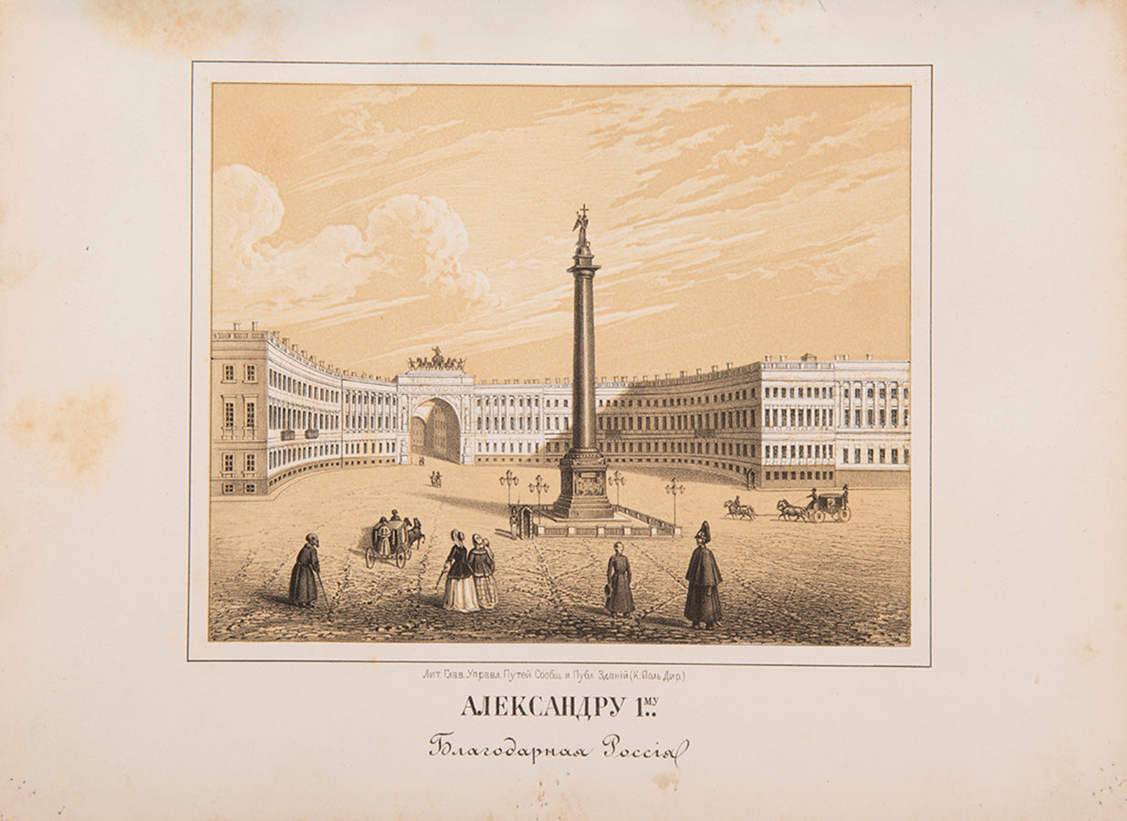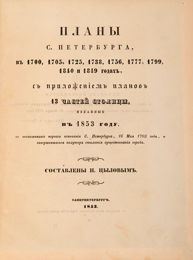 An excellent example of of this extremely rare work on St Petersburg, inscribed to Secretary of State Vladimir Ivanovich Panaev. It was compiled by the noted cartographer and statesman, Major-General Nikolai Ivanovich Tsylov who became famous for his address books and the topographical atlases of Saint Petersburg and Tsarskoe Selo. In 1849, under the orders of the Chief of police, Tsylov published the first street atlas of the city with a section on each of the thirteen districts.The present work includes the plans for each of the thirteen districts along with indexes detailing the palaces, street names and churches of each section. This edition is supplemented with five tinted lithographs, portraits of the Tsar and Peter the Great as well as 8 additional plans (the 1849 edition only having one general plan of the city for that year). Tyslov had consulted the city's archives and libraries to create plans starting from 1700, tracking how the boggy delta of the Neva was transformed into an established European capital of marble and stone. It's fascinating to see how the buildings and canals built up over the previous 150 years, spreading over the Vasilyevsky and Petrogradsky islands.