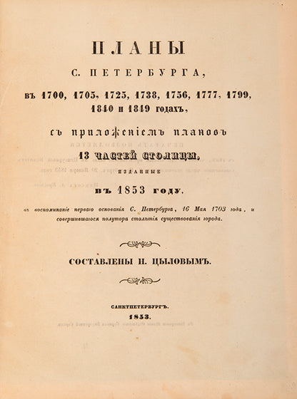 Plany S. Peterburga v 1700, 1705, 1725, 1738, 1756, 1777, 1799, 1840 и 1849 godakh, s prilozheniem planov 13 chastei stolitsy 1853 goda.