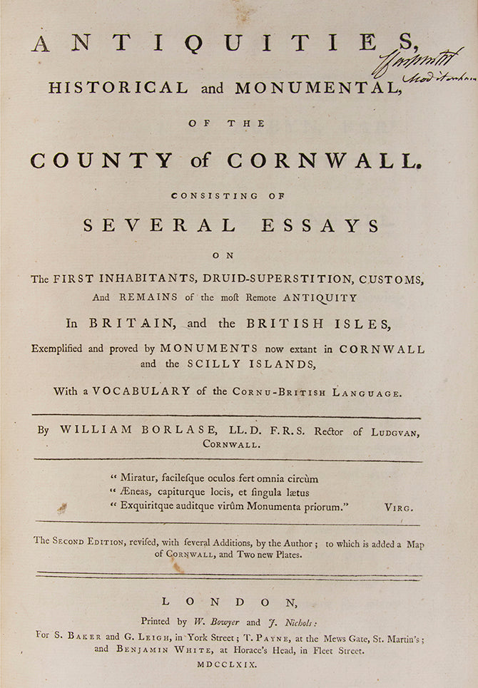 Consisting of several essays on the first inhabitants, druid-superstition, customs, and remains of the most remote antiquity in Britain, and the British isles, exemplified and proved by monuments now extant in Cornwall and the Scilly Islands, with a vocabulary of the Cornu-British language. By William Borlase, LL. D. F.R.S. Rector of Ludgvan, Cornwall.