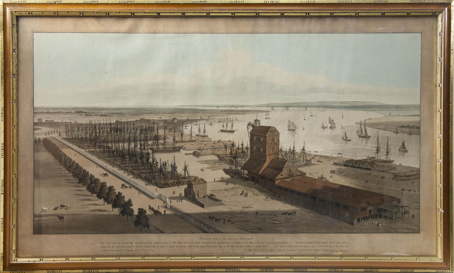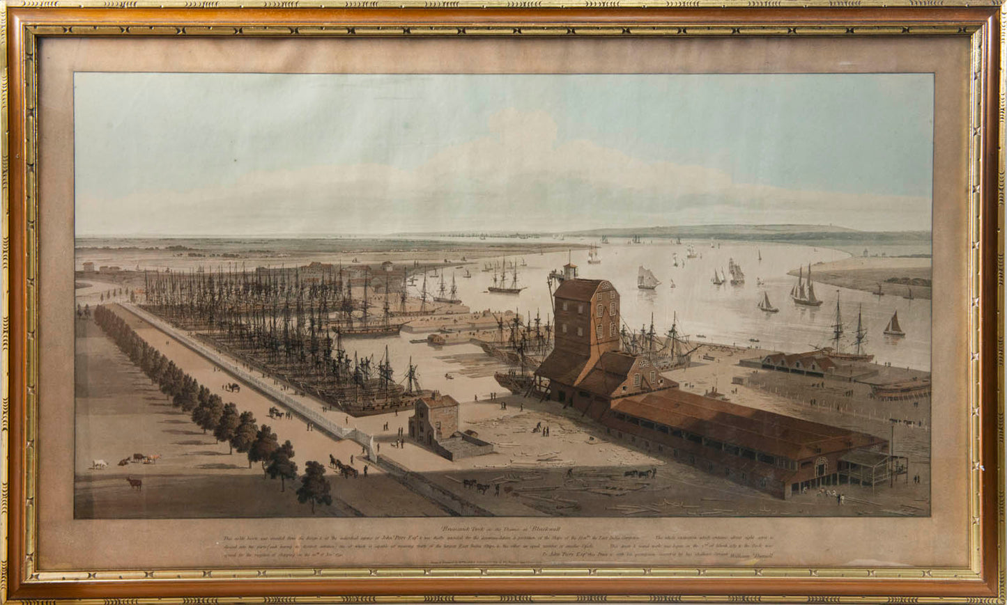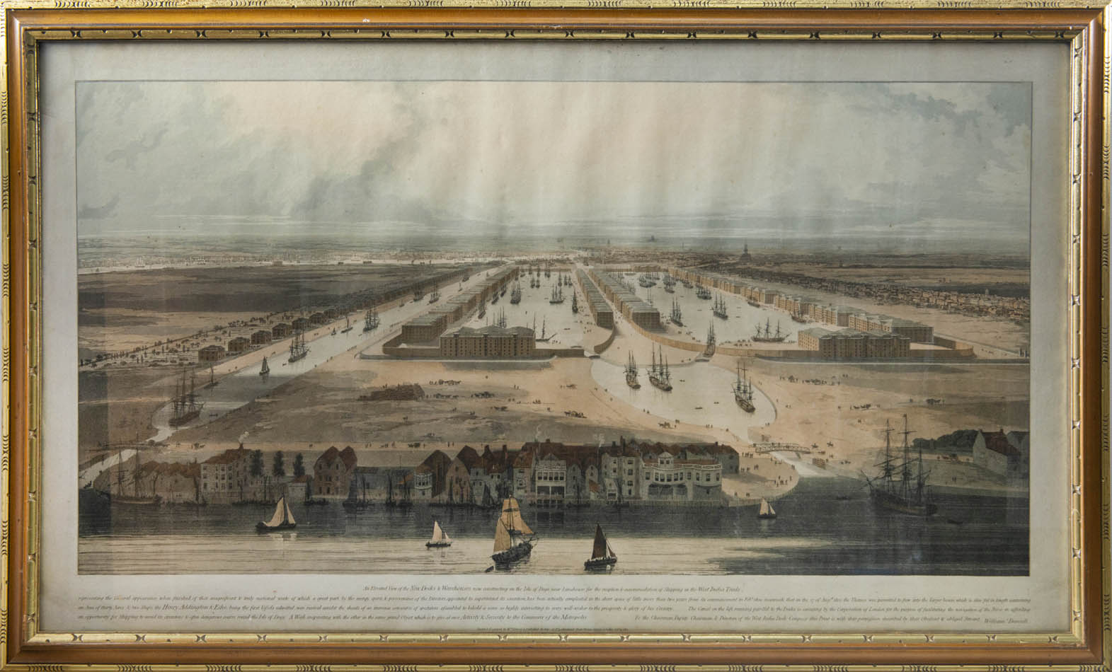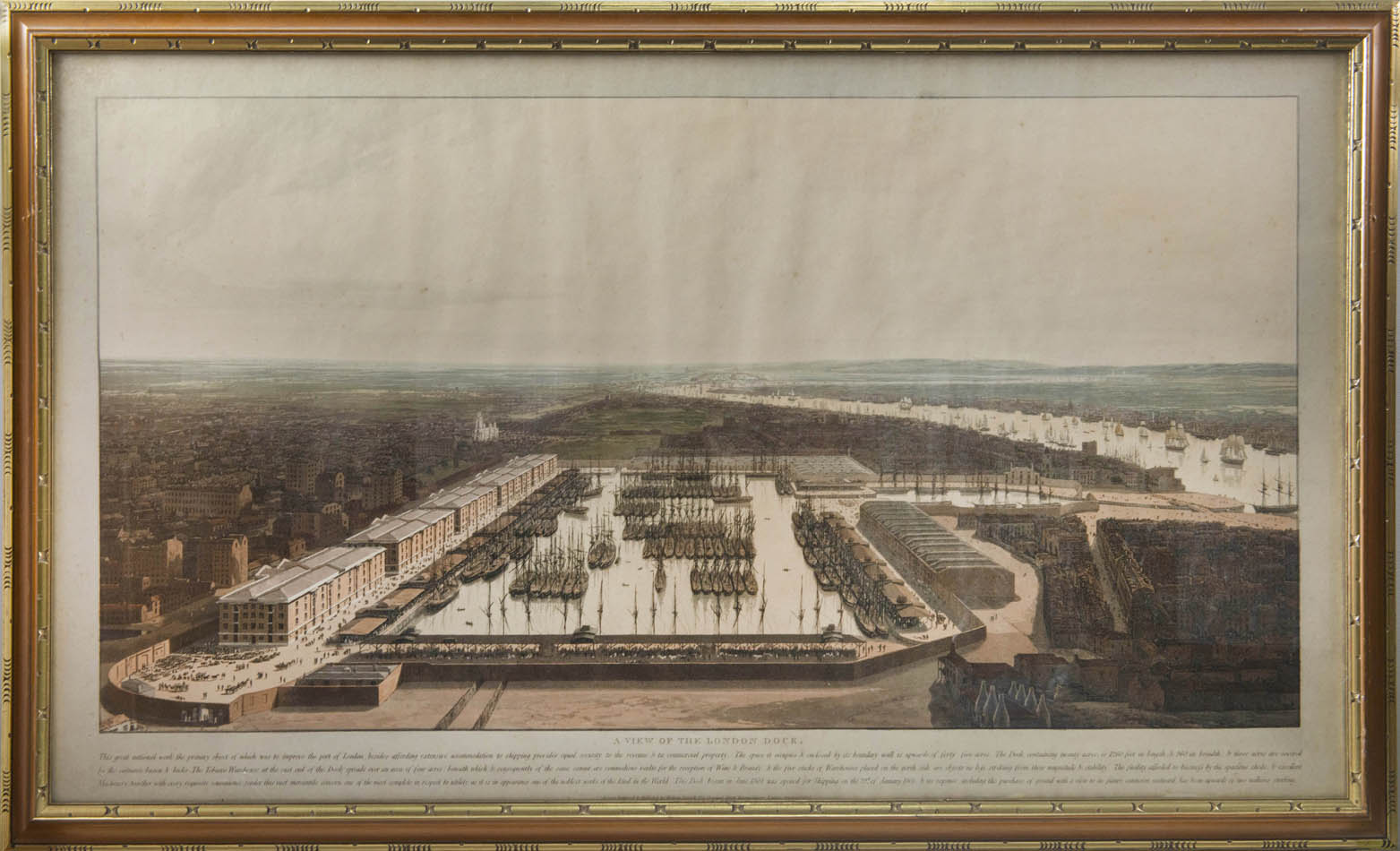 The views comprise: An elevated view of the New Docks and Warehouses... on the Isle of Dogs... 1802 (Sutton 17, 1)