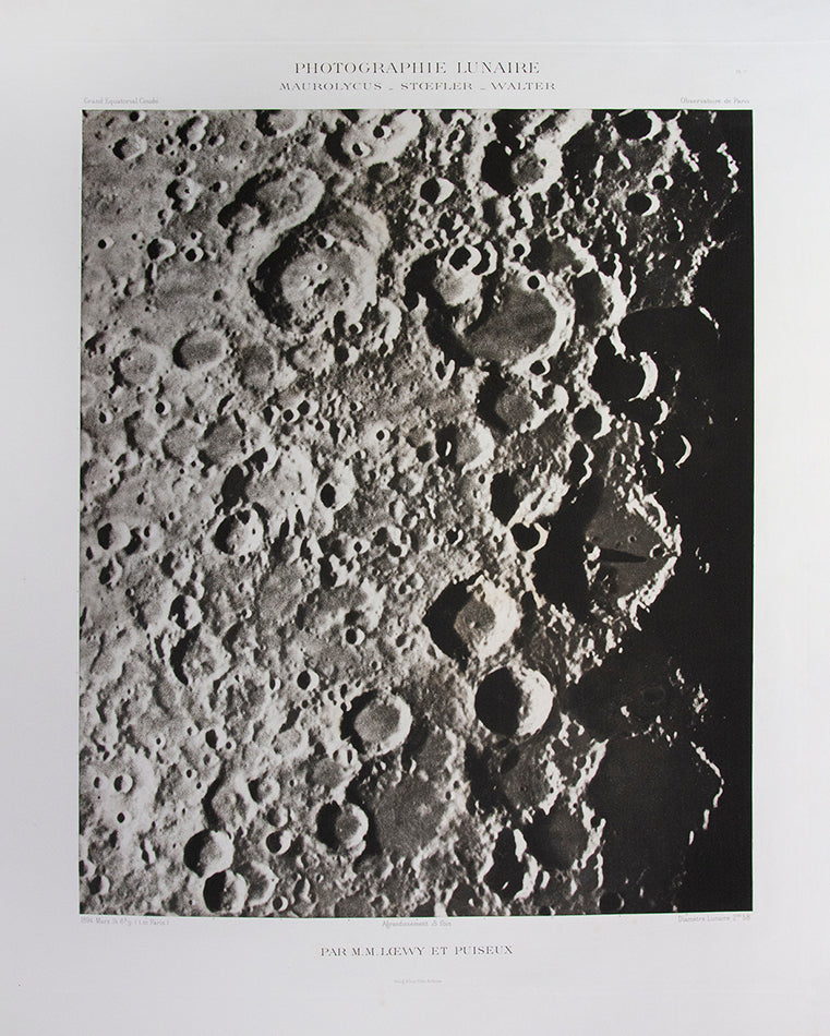 Moritz Loewy (1833-1907) and Pierre-Henri Puiseux (1855-1928), assisted by Charles Morvan, undertook a project to make a complete series of detailed photographs of the moon and the lunar surface. The two astronomers devoted approximately 500 evenings to observations in order to make more than 6,000 photographs of the moon. Their very best images were then published in L'Atlas photographique de la Lune. This was issued in fascicles from 1896 and 1910 by the Observatory of Paris, the atlas represents the best and most complete overview of the work of Loewy and Puiseux.