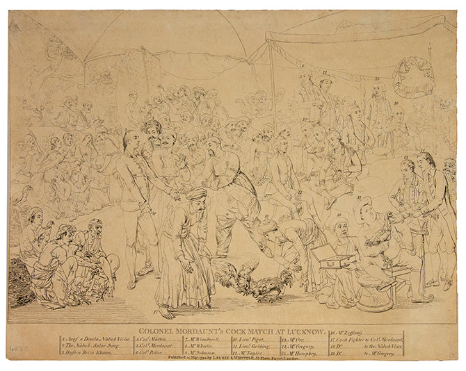 The contest is between the game-cocks of Colonel Mordaunt and the Nawab Wazir of Oudh, Asafud-dauba, who are seen facing each other with outstretched arms.The court of Lucknow, renowned for many extravagances, was especially celebrated for the sports of hunting and cock-fighting, in which the Nawab delighted. Mordaunt was a keen cock-fighter and had brought out from England game-cocks which he was confidant would defeat the native-bred cocks (Mary Webster, Johan Zoffany 1733-1810, Exhibition at the National Portrait Gallery, 1976, cat. no.104).