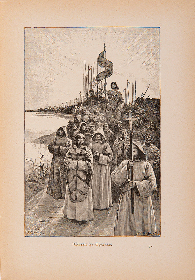 A fine example of the beautifully illustrated work by Granstrem (1843-1918), Russian writer and author of many popular gift books for children. Granstrem's publications hold a prominent place in pre-revolutionary Russian culture as they brought reading to a wider audience and captured the imagination of young adults.The aim was to educate Russians and broaden their horizons with informative books whilst attracting them with bold covers and numerous illustrations. There were various themes, including geography, the history of other nations, adventure stories and the lives of literary greats such as Shakespeare and Goethe. For this work on Joan of Arc, Granstrem drew inspiration from Mark Twain's 1896 novel Personal Recollections of Joan of Arc, by the Sieur Louis de Conte.