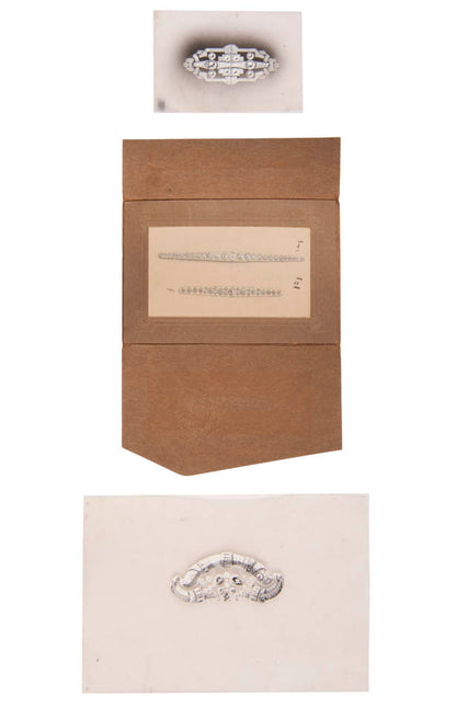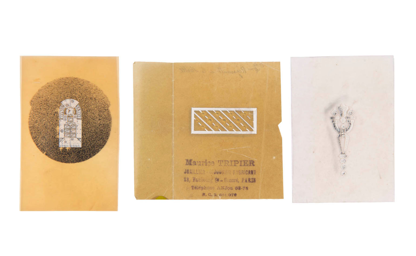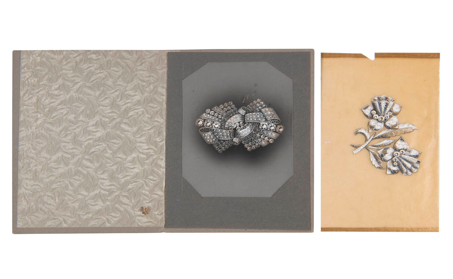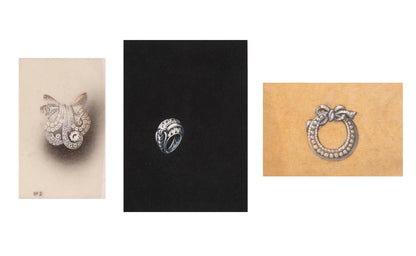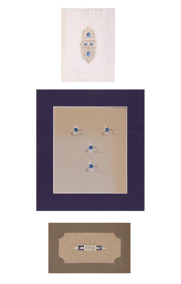 A collection of 14 Art Deco designs for jewellery pen & ink and water-colour & white, on cellulose and card; the larger design of four diamond and sapphire rings measures 200 x 160 mm; the others vary but approximately, 140 x 100 mm.