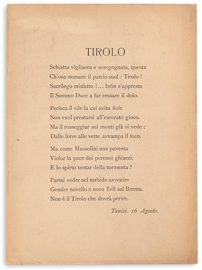 First edition; 8vo; single leaf, bifold, printed on all 4 pages, text in English and Italian, light edge-wear, else near-fine.