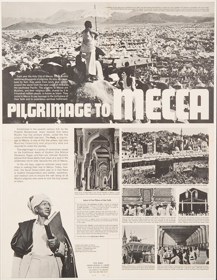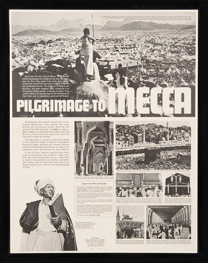 Vintage educational poster containing text about Hajj with photographic illustrations of Mecca, very slight darkening along old fold lines else bright and crisp example, framed and glazed. 785 x 425 mm.