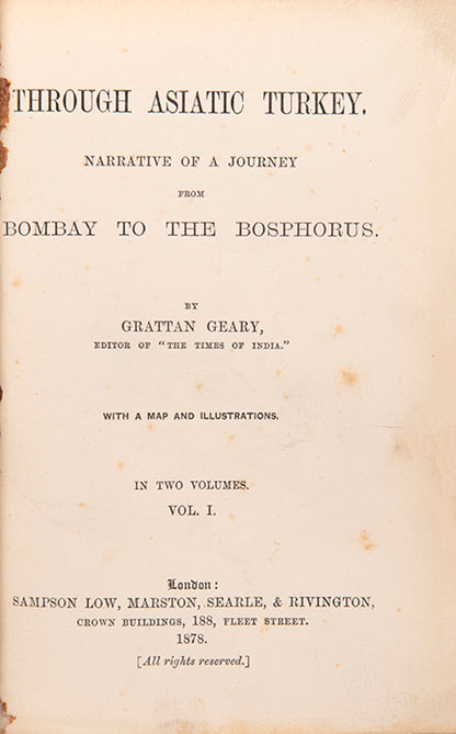 First edition; 2 vols in 1, 8vo; 2 frontispieces, folding coloured map, 13 wood-engraved plates, original red pictorial cloth gilt, all edges gilt, light fade to spine and corners, old ownership marks and inscriptions to front free endpaper (verso and recto), a very good copy; xvi, 339; xi, 356 pp.,