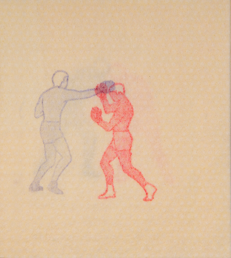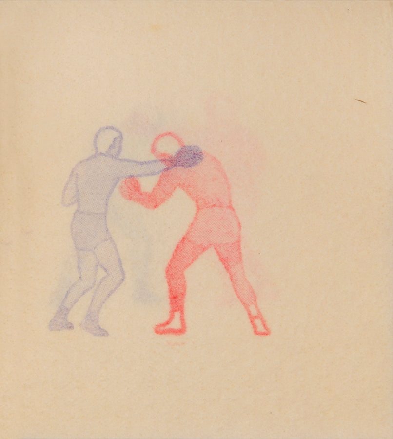 First edition, 100 unnumbered copies; small 4to (185 mm x 185 mm, 7¼ x 7¼ in); thick synthetic felt leaves with rubber stamped illustrations of boxers in red and purple, title in black; stapled and bound with black adhesive tape, minor creasing to last leaf, near-fine; 11 leaves.