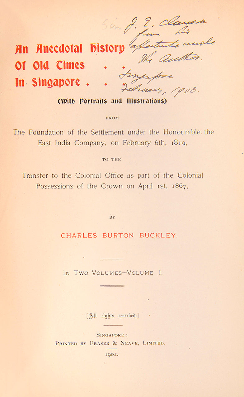 Buckley(1844-1922), arrived in Singapore in 1866. A standard history of Singapore in the nineteenth century.