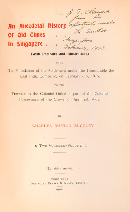 Inscribed by the author. Inscribed on the title: J. C. Clausen from his affectionate uncle, the Author, Singapore, February 1908.
