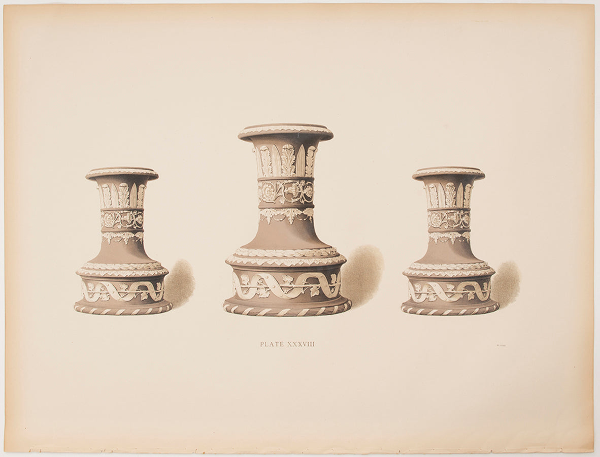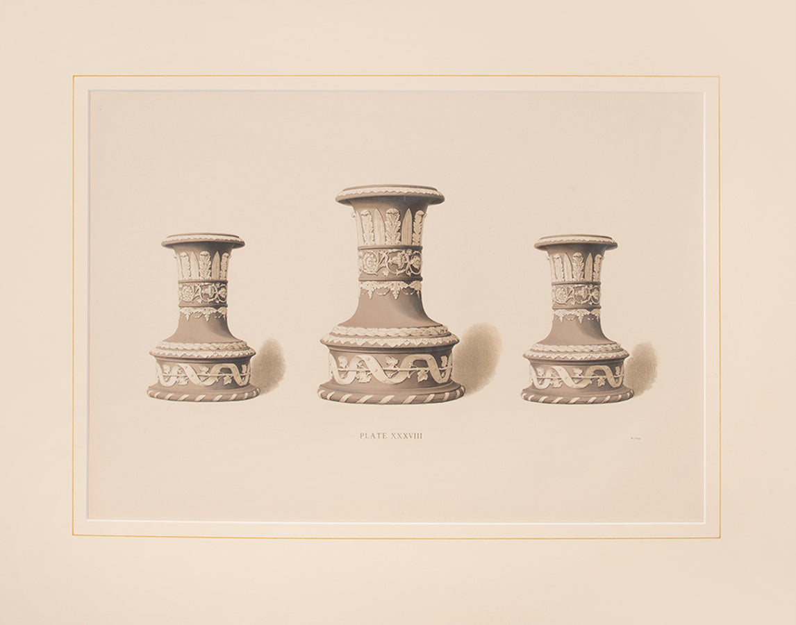 Original chromolithograph by W. Griggs from Old Wedgewood, the Decorative or Artistic Ceramic Work, in Colour and Relief, invented and produced by Josiah Wedgewood, at Etruria, in Staffordshire, 1760-1794.. Sheet size: 38cm x 50.5cm. Mounted, overall size: 47cm x 60cm.