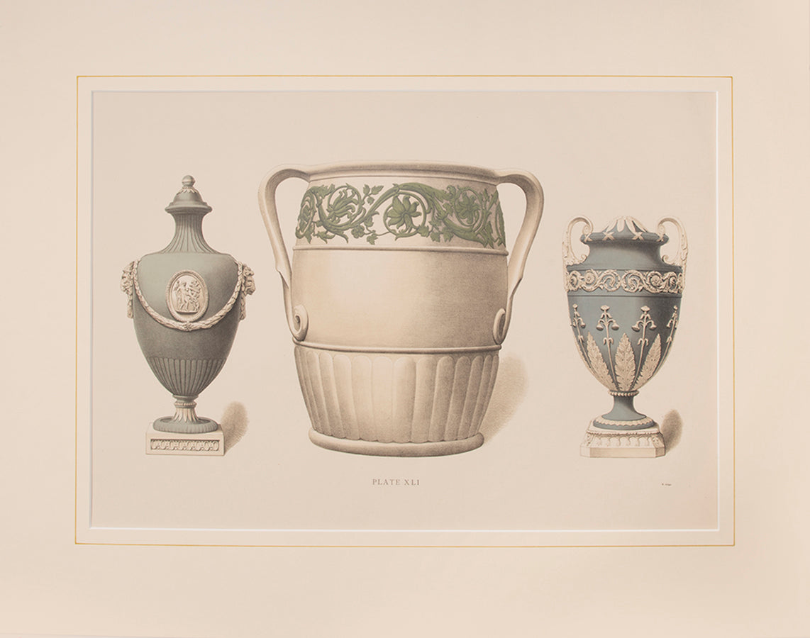 Original chromolithograph by W. Griggs from Old Wedgewood, the Decorative or Artistic Ceramic Work, in Colour and Relief, invented and produced by Josiah Wedgewood, at Etruria, in Staffordshire, 1760-1794.. Sheet size: 38cm x 50.5cm. Mounted, overall size: 47cm x 60cm.