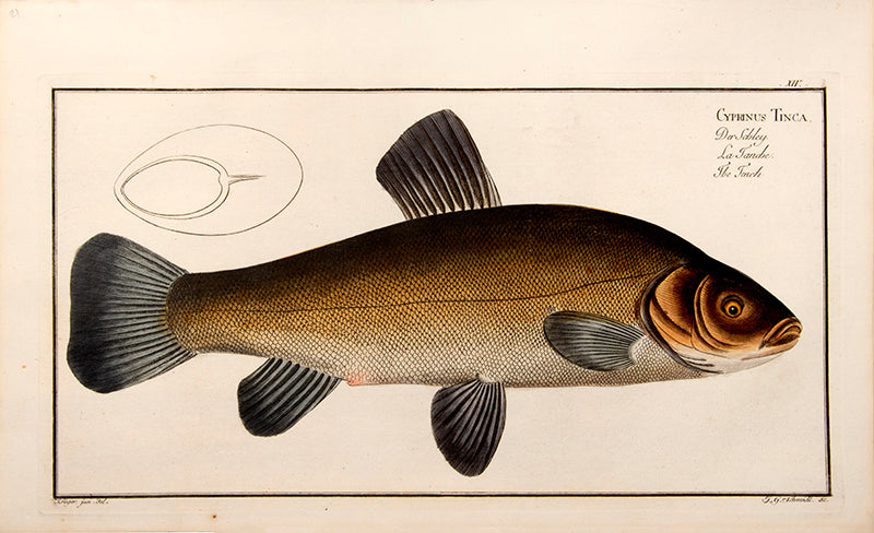 "Marcus Elieser Bloch is to fish what James Audubon is to birds. The Ichtyologie is the most outstanding of all fish books…the high quality of the engraving, the meticulous attention to detail and the exquisite colouring immediately distinguish them." S. Peter Dance & Geoffrey N. Swinney Classic Natural History Prints – Fish. London, 1990.