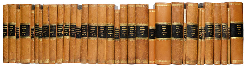 A rare complete set of the major, colour plate botanical work Deutschlands Flora by botanist and illustrator Heinrich Gottlieb Ludwig Reichenbach (1793-1879), published in instalments in 25 volumes between 1837 and 1867, and then continued in additional volumes through 1912.33 volumes (23 parts in 10 text volumes and 25 parts in 23 atlas volumes), 4to (varying sizes); 3,484 colour plates, contemporary manuscript annotations on the endpapers, uneven spotting and tanning of contents, plate 168 in volume 13-14 loose, small tear to plate 98 in volume 15; contemporary half calf, black morocco labels, marbled sides, bindings rubbed, volume 20 with loss from the top quarter of the spine, two volumes rebound to style a very good set.
