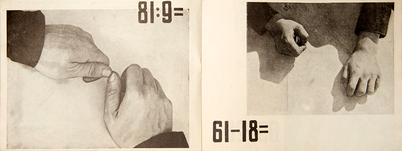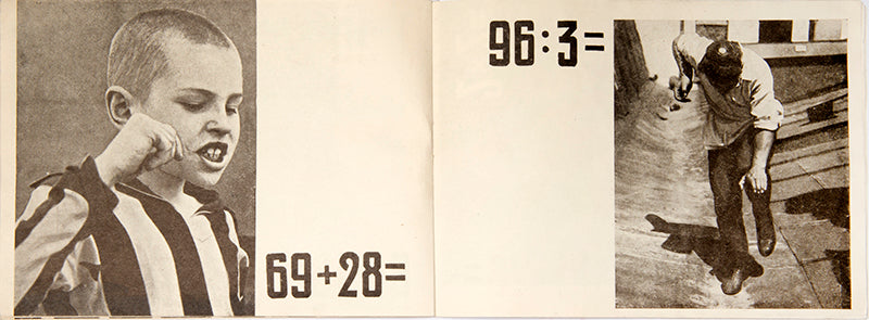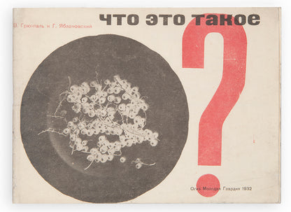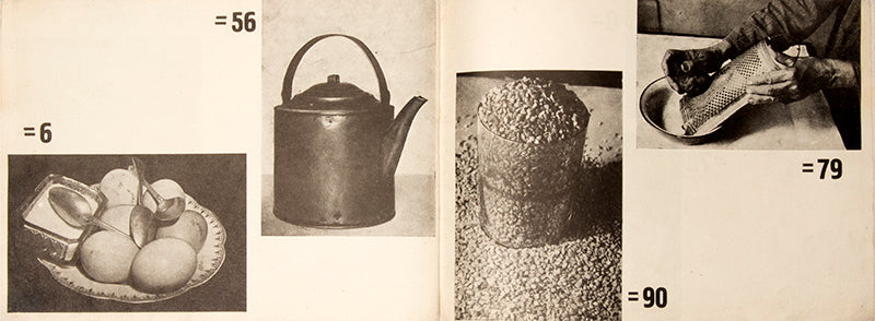 Vladimir Griuntal (1898-1963) was a Soviet avant-garde photographer and member of the October group. In 1932, he created a puzzle photobook 'What Is This?' together with G. Iablonovskiy. Their close-ups of food and items were printed as clues to math tasks for children and it is regarded as one of the most abstract photo abstract photo-publications of the 1930s.In the first half of the work, Griuntal's snimki-zagadki [snapshot-puzzles] ask the reader to guess at what is being pictured in black-and-white photographs and, at the same time, to solve a seemingly unrelated arithmetic problem. The answers to these visual and arithmetic puzzles are revealed in the latter half of the book. Objects which initially were shot from unexpected angles or shown in an unrecognisable close-up (such as a tea kettle shot from above) are revealed from a more familiar angle in the second half of the book. Here the photographed object and the solution to the mathematical problem are re-familiarised as a complete picture of a recognisable object from everyday life.