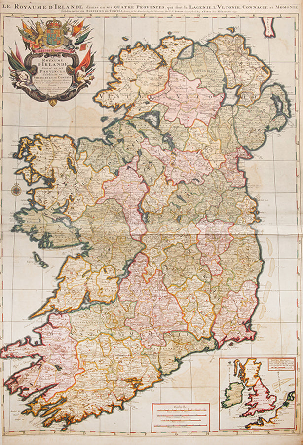 One of the best large format maps of Ireland issued in the late 17th, early 18th century. The map shows towns, counties, mountains, islands and a host of other fine details. The title cartouche is impressive, with the coat of arms all in stunning full original colour, delicately heightened in gold.Based upon the geographical compilations and work of Nicolas Sanson which remained unpublished at the time of his death. In 1674, Jaillot conceived of the re-issue of Sanson's major work (published and unpublished) in an enlarged format. The maps were issued as early as 1674 and were later jointly issued by Sanson and Mortier in Amsterdam.