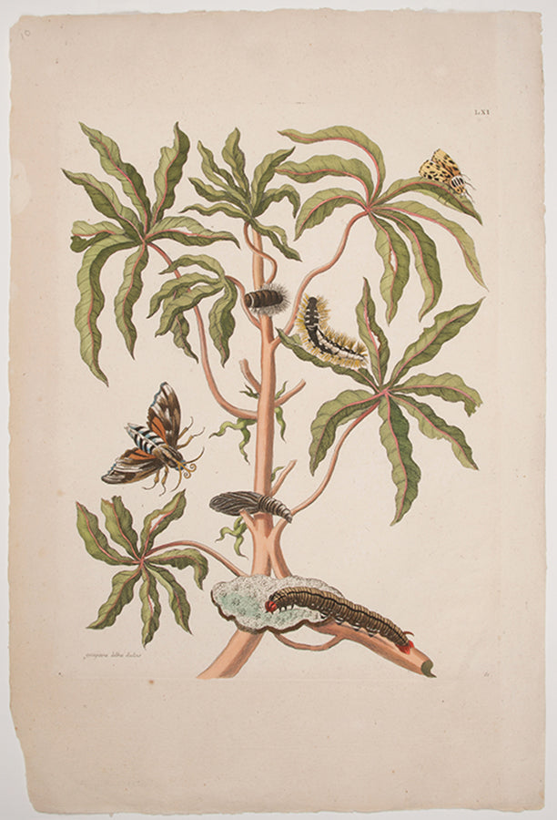 Maria Sybilla, daughter of the German engraver and publisher Matthias Merian, devoted herself to the study of European insects and their metamorphoses. As a result of the wealth of tropical varieties being brought back by the Dutch West Indies Company, she decided to visit the Dutch colony of Surinam herself to study and paint the insect life there. She sailed with her daughter Dorothea on June 1699 from Amsterdam, and remained in Surinam until 1701. Her work, first published in 1705, 'gave an unprecedented glimpse of the teeming insect life of tropical South America, with gorgeous butterflies flying around luxuriant flowering or fruiting plants and with large many-coloured caterpillars crawling over the leaves. [The plates] have earned Maria Merian an honoured place in the history of tropical entomology as also in botanical illustration' (W.T. Stearn, introduction to The wondrous transformation of caterpillars, 1978).