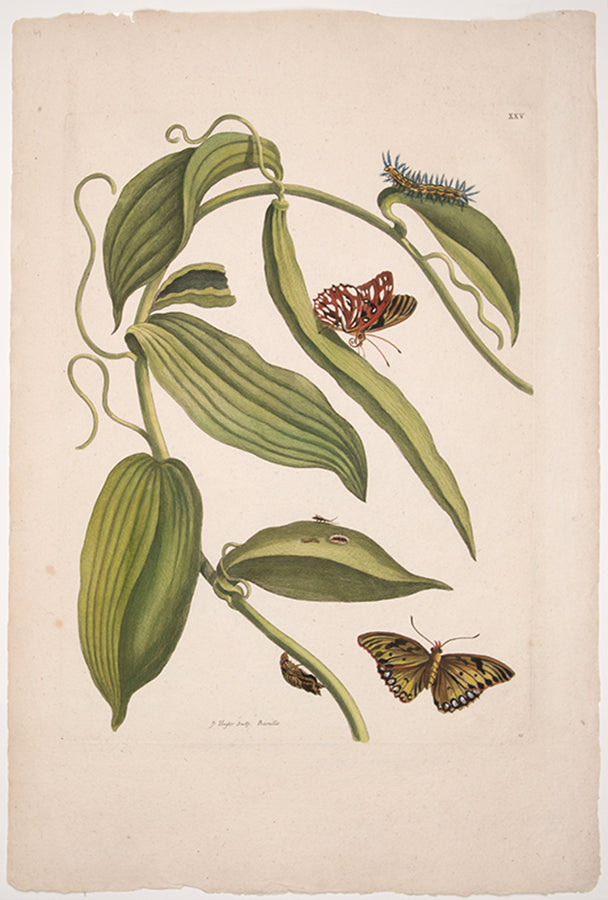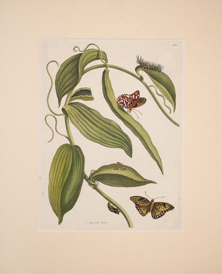 Maria Sybilla, daughter of the German engraver and publisher Matthias Merian, devoted herself to the study of European insects and their metamorphoses. As a result of the wealth of tropical varieties being brought back by the Dutch West Indies Company, she decided to visit the Dutch colony of Surinam herself to study and paint the insect life there. She sailed with her daughter Dorothea on June 1699 from Amsterdam, and remained in Surinam until 1701. Her work, first published in 1705, 'gave an unprecedented glimpse of the teeming insect life of tropical South America, with gorgeous butterflies flying around luxuriant flowering or fruiting plants and with large many-coloured caterpillars crawling over the leaves. [The plates] have earned Maria Merian an honoured place in the history of tropical entomology as also in botanical illustration' (W.T. Stearn, introduction to The wondrous transformation of caterpillars, 1978).