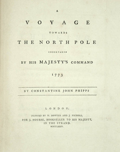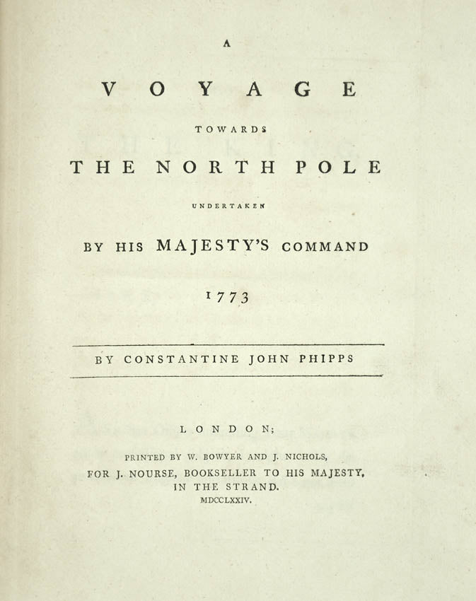 "This expedition of the Racehorse and Carcass, undertaken for the purpose of discovering a route to India through the northern polar regions was blocked by pack ice north of Spitzbergen. The valuable appendix gives geographical and meteorological observations, zoological and botanical records, accounts of the distillation of fresh water from the sea, and astronomical obsevations. The voyage is perhaps better remembered for the presence of a young Horatio Nelson, as midshipman aboard the Carcass, and his encounter with a polar bear" (Hill).
