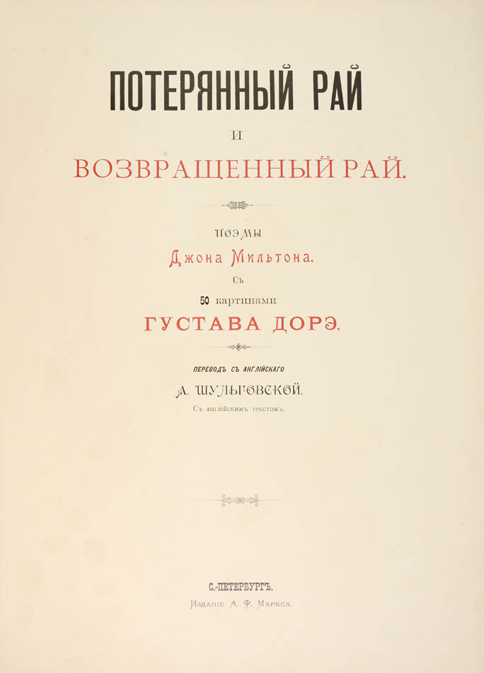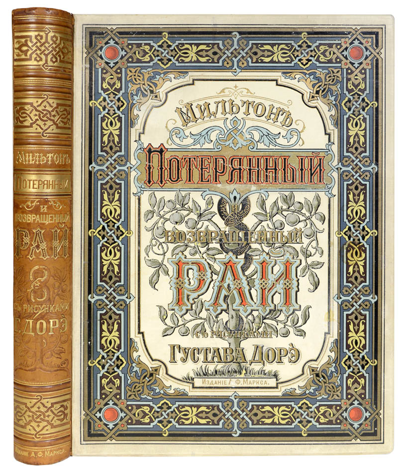 Large 4to (41.6 x 32 cm), XVIII, 332, [4] pp., parallel text in Russian and English, with 50 plates by Gustave Doré for Paradise Lost. Original publisher's cream cloth richly decorated in colours and gold on upper cover, calf spine embossed and gilt, green silk page-marker with a small metal embossed tag in the shape of a book, small area of loss to plate 49.