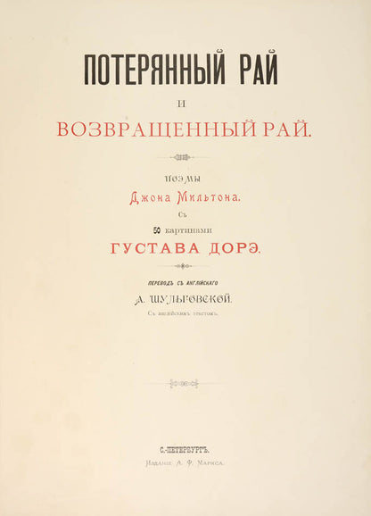 It took two years for the Saint Petersburg leading publisher Marks to prepare the Milton's masterpiece for publication, and the first edition finally came out in 1878. Marks was hoping that "the Russian public will receive the book with at least a fraction of that love and affection that I have invested in it. Starting work on this edition I don't count on its global success; and I know that I won't be even able to cover my costs for another several years. But it only proves that there are still idealists in this world, who are ready to work without hope for receiving any benefits in near future".