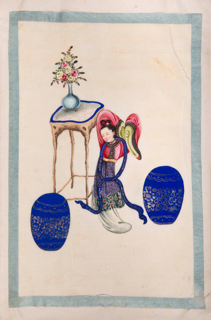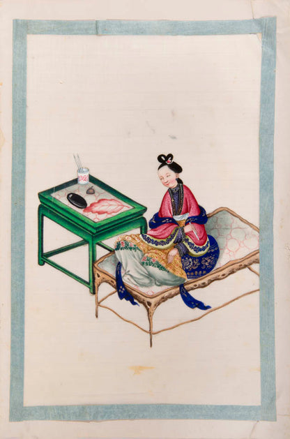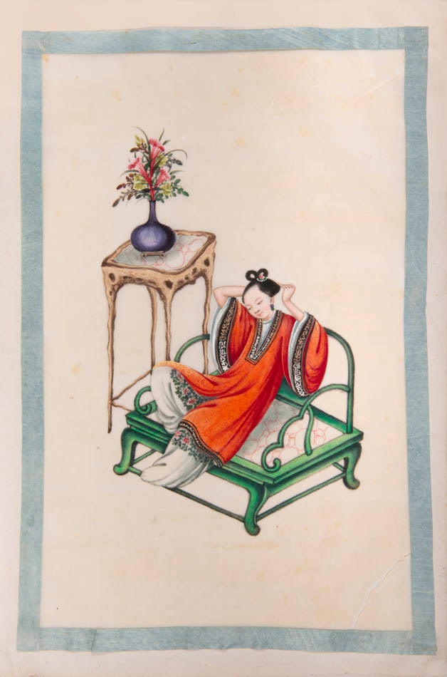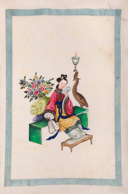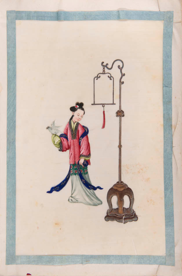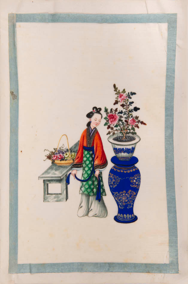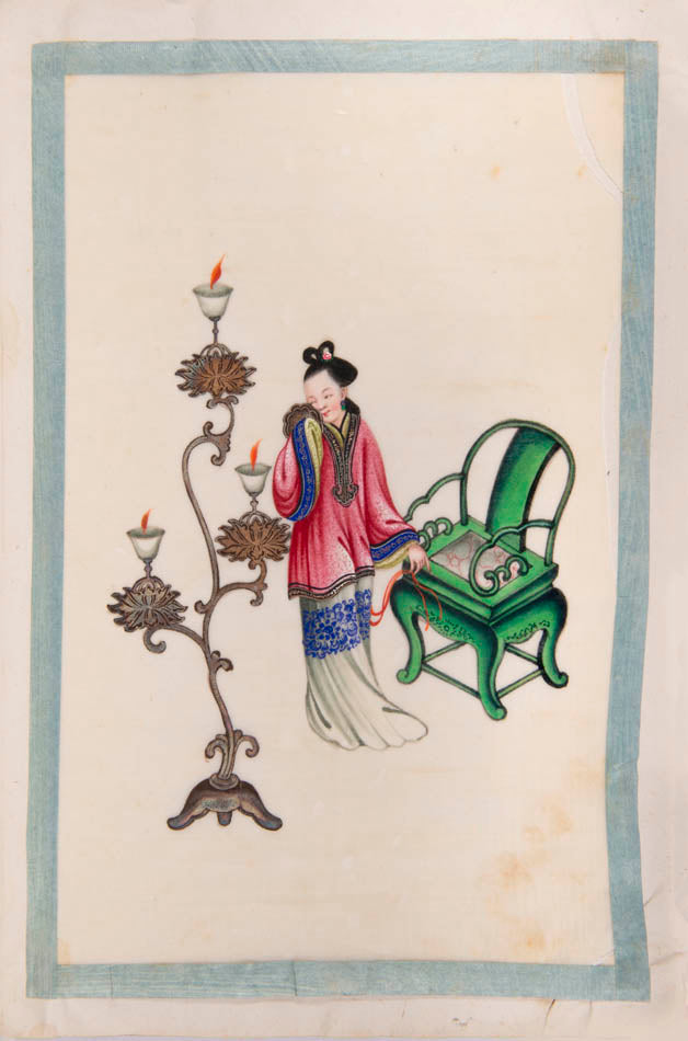 Pith came into use for painting to satisfy the increasing demand for small, inexpensive and easily transported souvenirs, following the massive growth in the China Trade in the first quarter of the nineteenth century. Paintings in oils, on board and canvas were costly and difficult to carry home. Earlier and more prestigious export water-colours had often been on a larger scale and painted on fine Chinese paper or on paper imported from Europe. The albums of pith paintings (and later the little glass-fronted boxes) were inexpensive, light, easy to pack and gave the pictures some protection on the long voyage home. Because many were sold in albums and hence protected from the light, they retain their bright colours to this day.