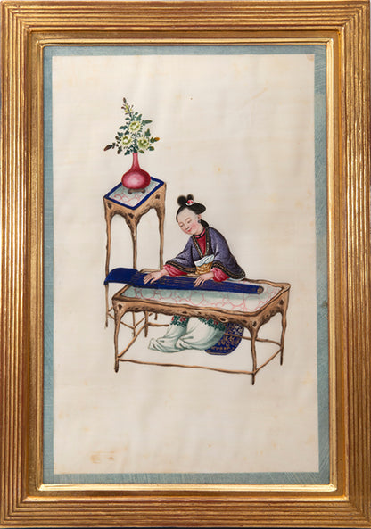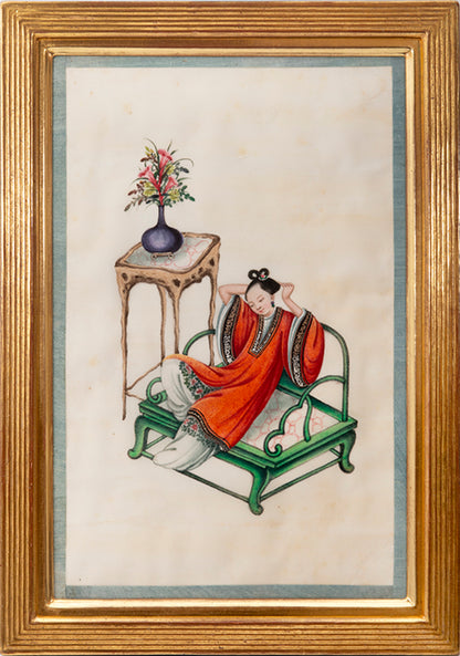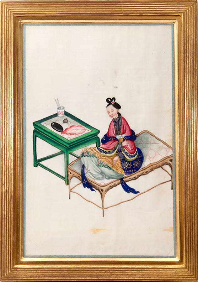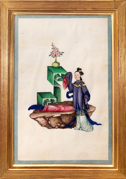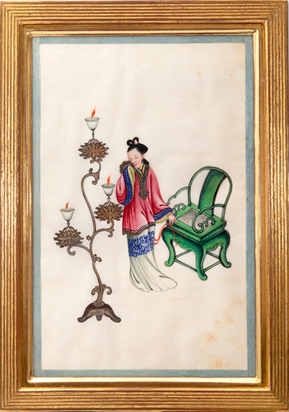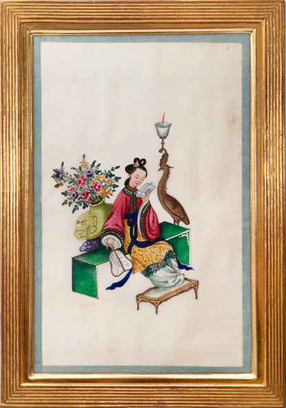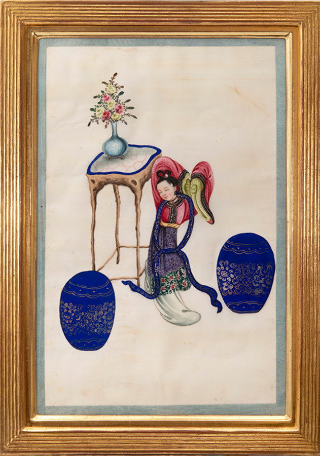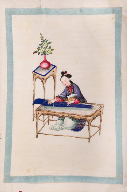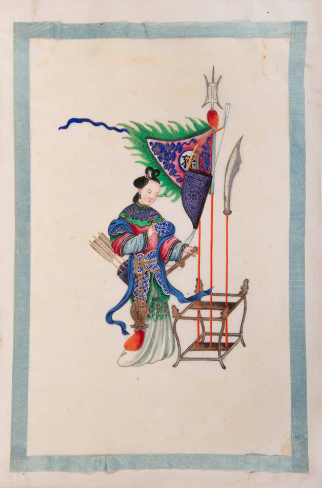 Pith came into use for painting to satisfy the increasing demand for small, inexpensive and easily transported souvenirs, following the massive growth in the China Trade in the first quarter of the nineteenth century. Paintings in oils, on board and canvas were costly and difficult to carry home. Earlier and more prestigious export water-colours had often been on a larger scale and painted on fine Chinese paper or on paper imported from Europe. The albums of pith paintings (and later the little glass-fronted boxes) were inexpensive, light, easy to pack and gave the pictures some protection on the long voyage home. Because many were sold in albums and hence protected from the light, they retain their bright colours to this day.