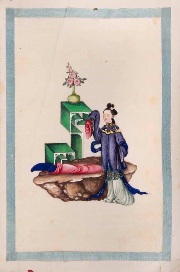 12 hand painted water-colours on pith paper, pale blue silk borders, a few minor cracks and tears to rice paper as often; framed and glazed, overall dimensions: 38.7cm by 27cm by 2cm.
