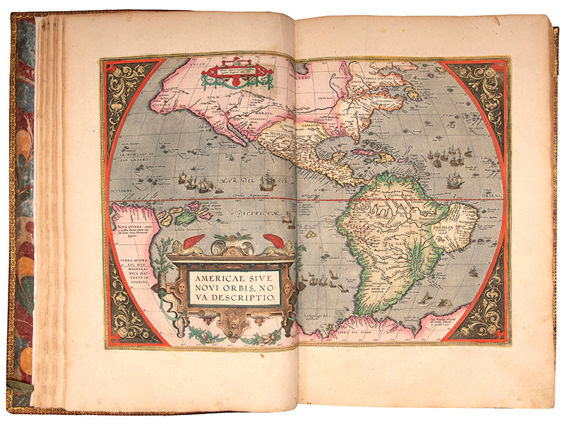 Large folio (480 x 300mm); [Theatrum] text in Latin, engraved title, coat of arms, epigraph and portrait of Ortelius, all coloured by a contemporary hand with gilded detailing, 118 plates, all coloured by a contemporary hand, all woodcut initials coloured by a contemporary hand (some light, variable spotting and offsetting, marginal spitting, a few repaired tears); [Parergon] engraved title and 38 plates, all coloured by a contemporary hand (some light spotting and offsetting, a few small tears); [Nomenclator] title page with hand-coloured vignette; finely bound in modern red morocco, spine richly gilt in 8 compartments, green ties.
