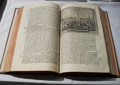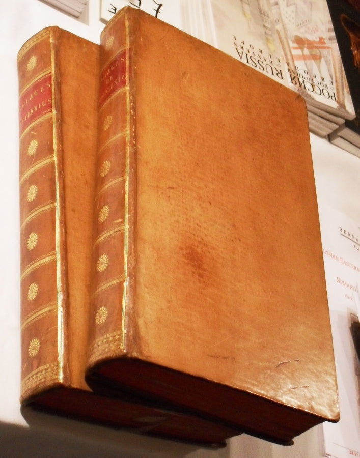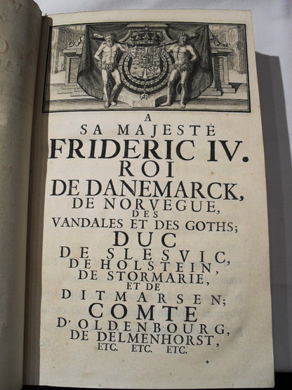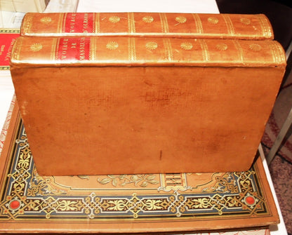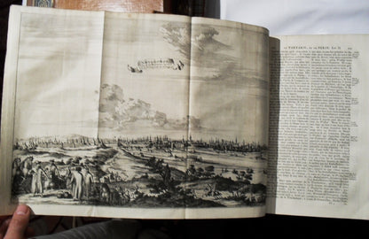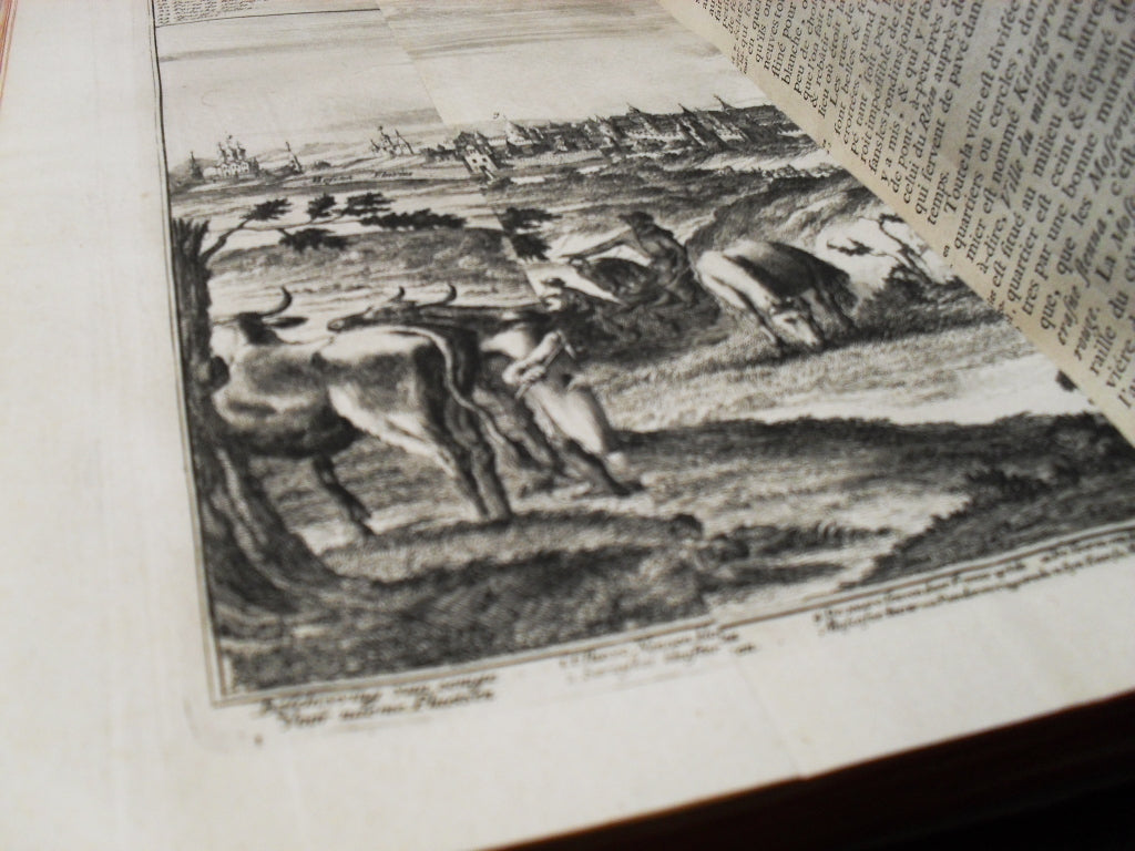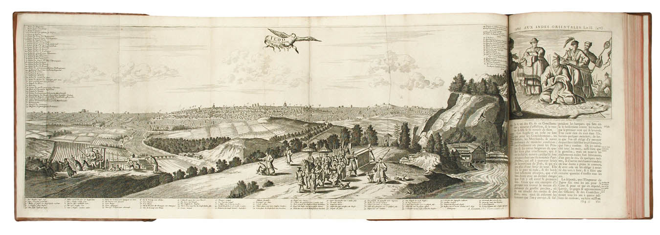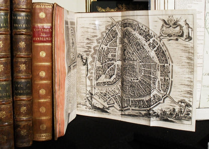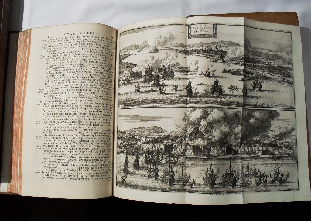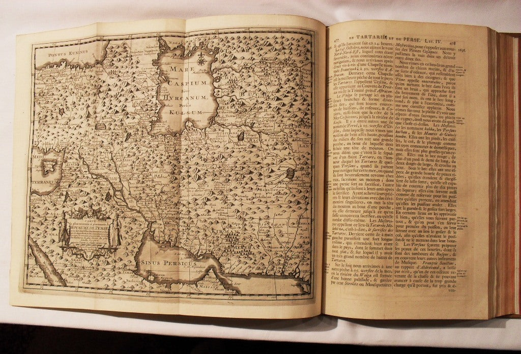 Two volumes folio (32.5 x 21 cm). First work with half-title, title, [32] pp., 560 columns on [280] pp., with engraved portrait of the author, 2 folding and 10 double-page engraved maps, 2 folding, 17 double-page and 2 full-page engraved plates, and 40 engravings in text; Second work with half-title, title, additional engraved title, 565-1108 columns on [272], [21] pp. table and privilege, with 8 double-page engraved plates and 19 engravings in text, some plates by Nicolas Witsen; contemporary blonde calf, spines in seven compartments, red morocco lettering piece to second, others others with gilt centre tool, broad gilt dividers, occasional light browning and offsetting, hinges a bit weak, overall a fine fresh set.