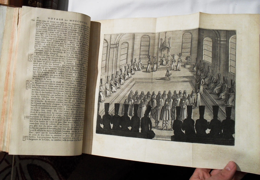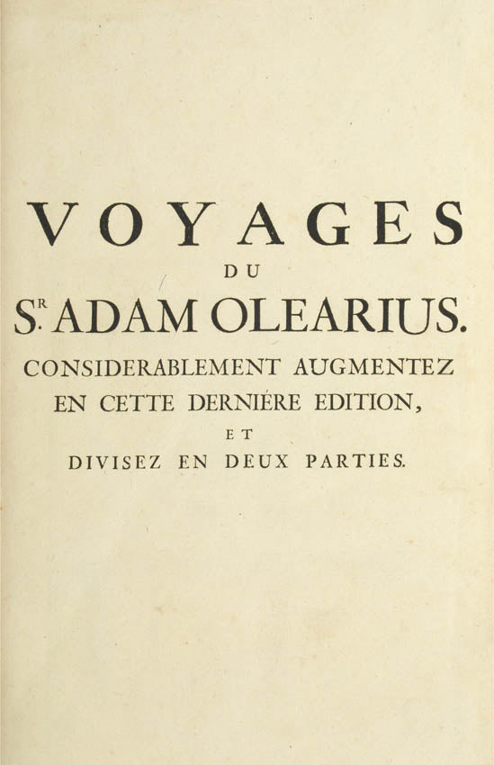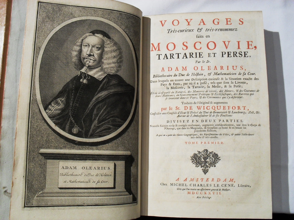 Part of the same embassy, Mandelslo travelled onward to India, to observe the Mughal Empire, Siam, Japan and China. Both accounts are often, but not always, found together.