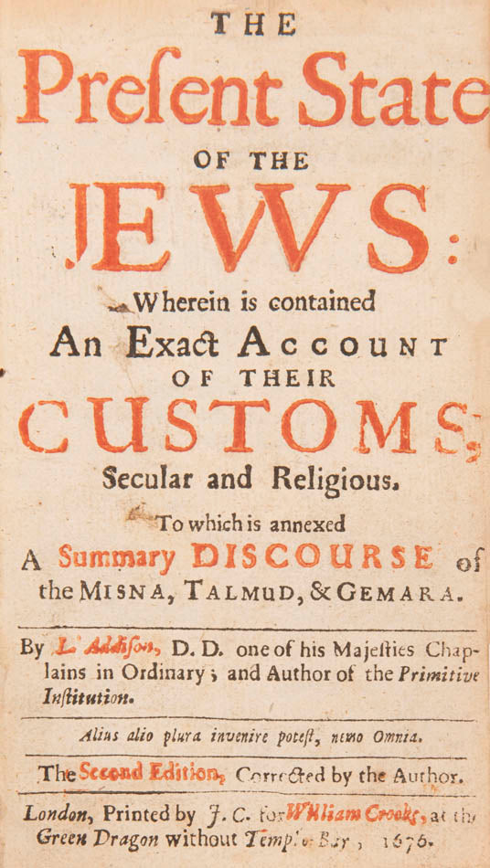 Lancelot Addison (1632-1703) was an English author and Church of England clergyman, he was educated at Queens College, Oxford, and worked as a chaplain in Tangier for seven years in the 1660s. Some scholars point out that part of this work largely repeats material found in the English translation of Johannes Buxtorf's Synagoga Judaica: The Jewish Synagogue, or, an Historical Narration of the State of the Jewes... (London, 1657).