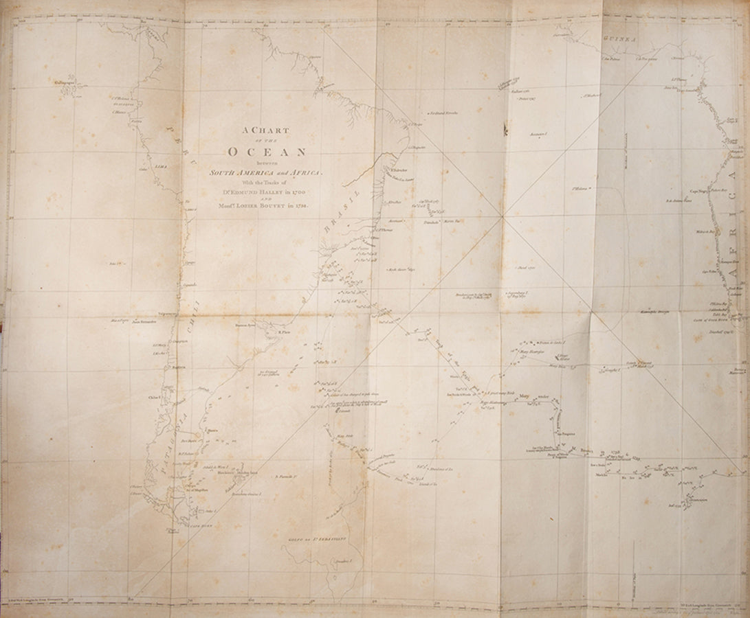 First (only) edition, 4to, [iv], 20, [ii], 22, 88, 16, 16, 14pp., half-title, contents leaf, 3 engraved maps, 2 folding, extra-illustrated with a large folding chart of the Atlantic on thicker paper, contemporary sprinkled calf gilt, red morocco label, half-title browned, joints rubbed, small split to upper join professionally repaired, some browning towards the end, 2 leaves (in the Extrait) with paper repairs to lower margin not affecting text, a very good copy.