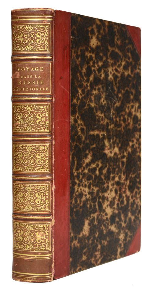 Count Anatoliy Nikolaevich Demidov, Prince of San Donato (1812-70) launched in 1837 at his own expenses a scientific, chiefly geological, expedition to Ukraine and Crimea. He was accompanied in his extensive travel by the artist Denis Raffet, who richly illustrated the account - the 64 illustrations in the title refer to both the woodengravings in the text and plates together.