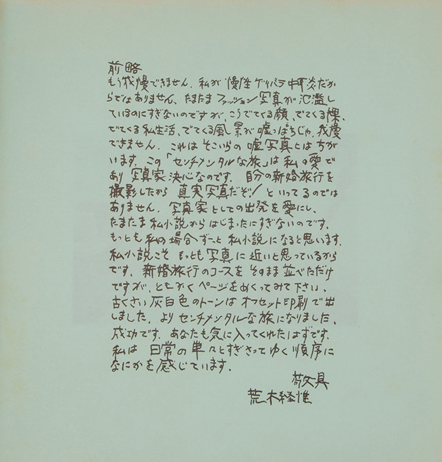 Initially, Araki had intended for Sentimental Journey to contain no text. However, after publication and at the request of the bookshop Kinokuniya, he wrote a short introduction that rejects the falseness and insincerity of much photography and compares his work to the popular post-war literary form of the 'I' novel. This text was printed on a green leaf of paper and laid into the book.
