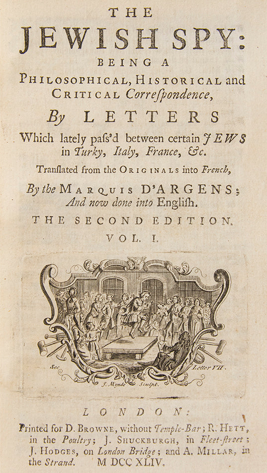 With an interesting dedicatory epistle to 'The Printer's Devil', a moniker for the young apprentice so-named from being 'daub'd with the Printer's Ink' (Preface).The book is written in the form of correspondence between rabbis in different capitals of Europe, with a survey of the cities