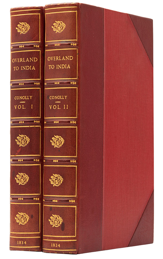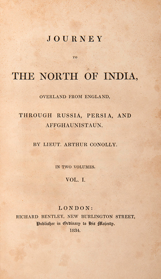 'Being in England on sick leave in 1829, Conolly obtained leave to return to India through central Asia. He left London on 10 August 1829, travelled through France and Germany to Hamburg, then continued by sea to St Petersburg, where he stayed a month, and then travelled via Tiflis and Tehran to Asterabad. There he disguised himself as an Asian merchant, with a stock of furs and shawls, hoping to reach Khiva. He left Asterabad for the Turkoman steppes on 26 April 1830, but when the little caravan to which he attached himself was about halfway between Krasnovodsk and Kizil Arvat he was seized by nomads and robbed. The Turkomans were undecided whether to kill him or sell him into slavery. Tribal jealousies in the end secured his release, and he returned to Asterabad on 22 May 1830, from where he travelled to India by way of Mashhad, Herat, and Kandahar, visiting Sind, and finally crossing the Indian frontier in January 1831. He published a lively narrative of the journey—reflecting his bright, hopeful temperament—A Journey to Northern India (1834)' (ODNB).
