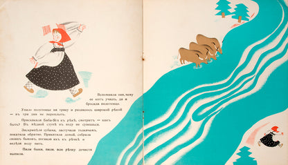 Baba Yaga is a tale about the witch-like character of the same name who lives in the forest and frequently appears in Russian folklore tales. Since Alexander Afanaseev began to collect and publish fairy tales in the mid 19th century many numerous illustrated versions of Baba Yaga appeared but this émigré publication is of particular rarity and charm.