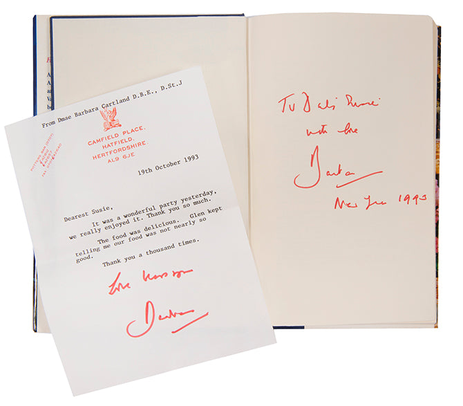 Presentation copy. First edition inscribed by the author to her neighbour Susie Walduck in red ink on front free endpaper, 'To darling Susie / with love / Barbara / New Year 1993'. Together with a typed letter signed on Cartland's stationery, thanking Walduck for a party they attended.