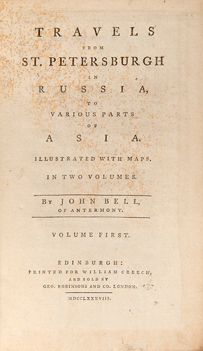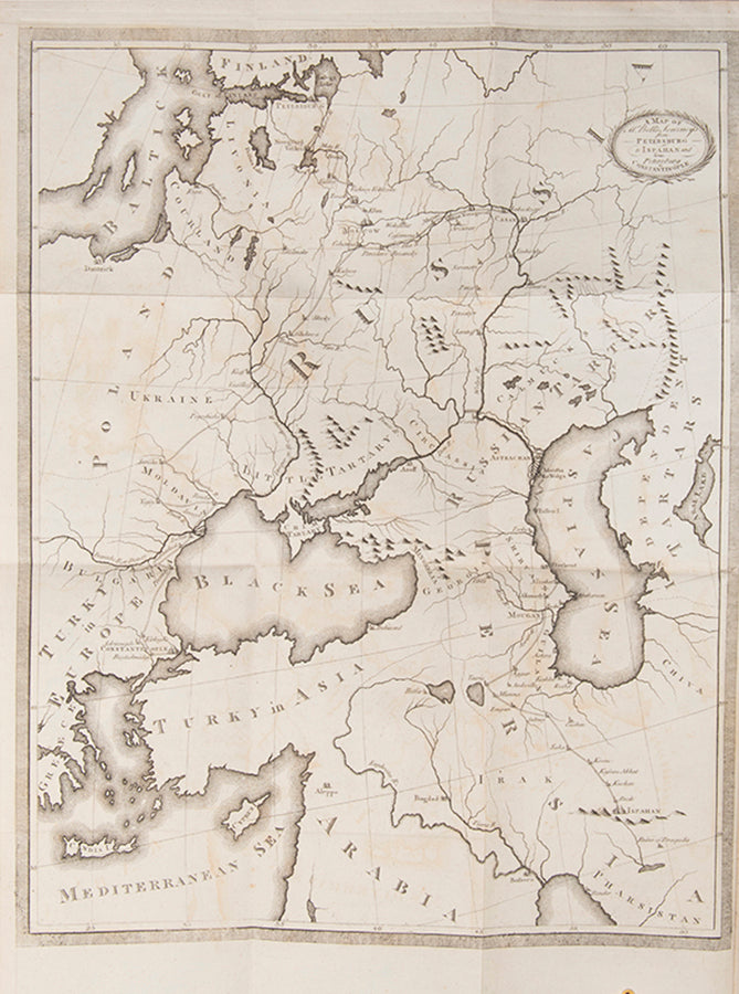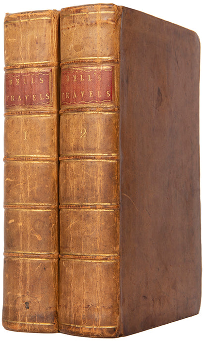 2 vols, 8vos (20.8 x 12.5 cm); 2 large folding engraved maps ('Petersburg to Ispahan and from Petersburg to Constantinople' and 'Moscow to Pekin'), touch of foxing to first few leaves, occasional unobtrusive pencil annotations, a couple of small repaired marginal tears, loss to outer margin of p125-6 avoiding text; contemporary full calf, spine in five gilt ruled compartments, gilt red morocco lettering pieces, all edges speckled red, light wear to extremities, small wormhole to bottom compartment of vol 1, a very good set; xvi, 442; vi, 554pp.