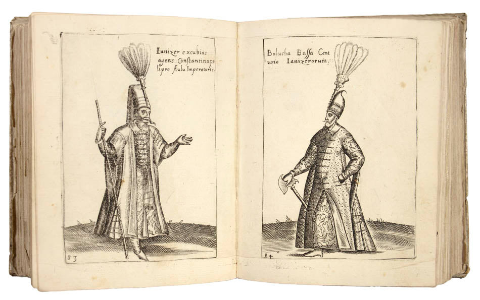 Second edition. 2 parts in 1 volume, small 8vo (14.5 x 10.5 cm)., 1st part: engraved title, [iv] pp., engraved coat-of-arms, 106 engraved plates including 2 folding panoramas (1 with small hole with loss to image), 1 with overslip; 2nd part: engraved title, [iv] pp., engraved coat-of-arms, 79 engraved plates including 1 folding panorama, 2 with overslips, plate 26 signed"H. R.", plates 63 & 64 "execudit de Franco", occasional light waterstain, occasional light soiling, generally in excellent condition, contemporary vellum, lightly shaken.