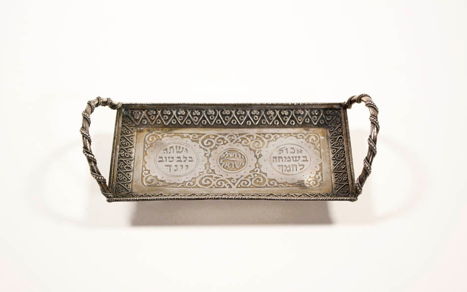 Tapered tray with applique filigree and acid etched organic tendrils, with Hebrew verse from Ecclesiastes (9:7) 'Eat your bread with joy and drink your wine with a good heart'. With arched handles; the whole supported on four ball feet. Length: 146mm. Salt and pepper cellars, similarly decorated with filigree and acid-etched Hebrew labels. Small dent to lid of pepper. Height: 50mm. Stamped in Hebrew Bezalel Jerusalem, with silver marks.